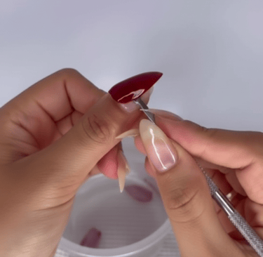 Com o palito presente no kit, encaixe-o abaixo da press-on nail e empurre em forma de alavanca para que se descole.